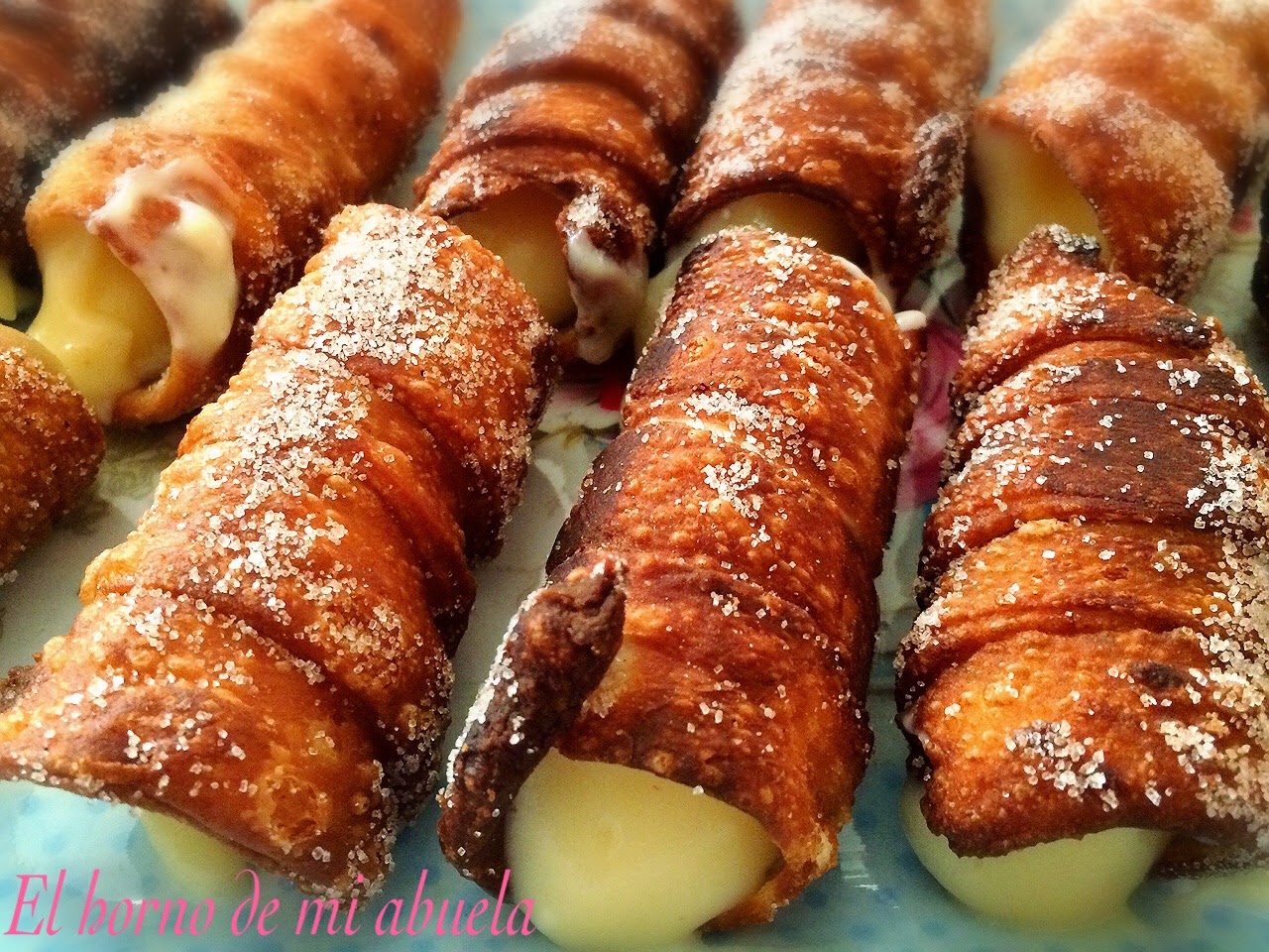 Al parecer tienen un origen Árabe y en Italia y en concreto en Sicilia hay también un postre similar llamado Cannoli sicilianos pero que se rellenan de queso ricota.